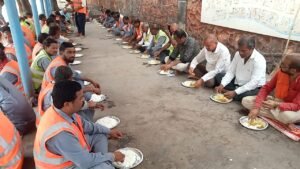 धरना स्थल पर पहुंचे किसान नेता राजू शर्मा ने मिठाई बांटकर मजदूरों को हौसला दिया। उन्होंने कहा —