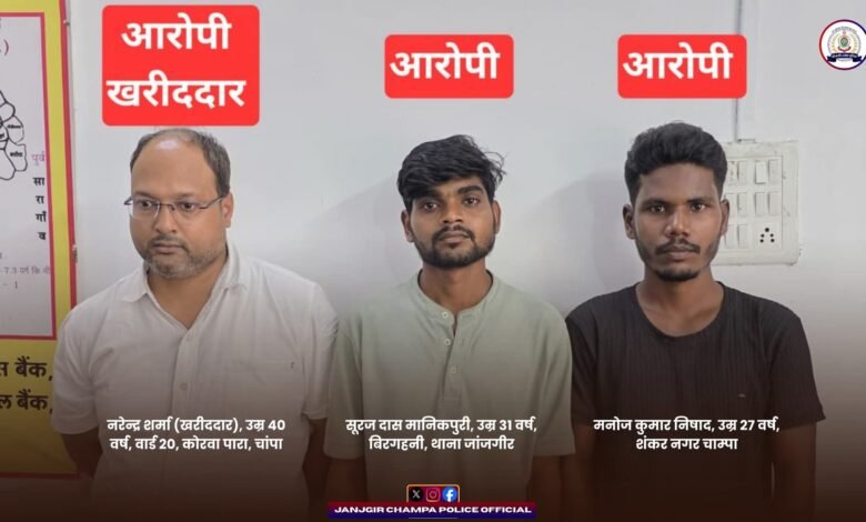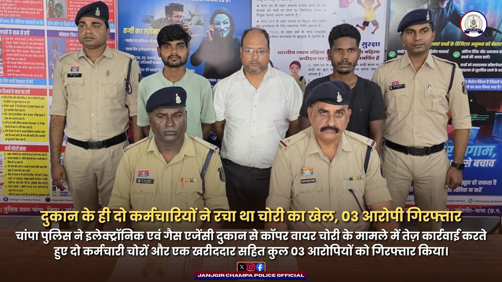 चांपा। स्थानीय पुलिस ने इलेक्ट्रॉनिक एवं गैस एजेंसी दुकान से कॉपर वायर चोरी के मामले में तेज़ कार्रवाई करते हुए दो कर्मचारी चोरों और एक खरीददार सहित कुल तीन आरोपियों को गिरफ्तार किया है।