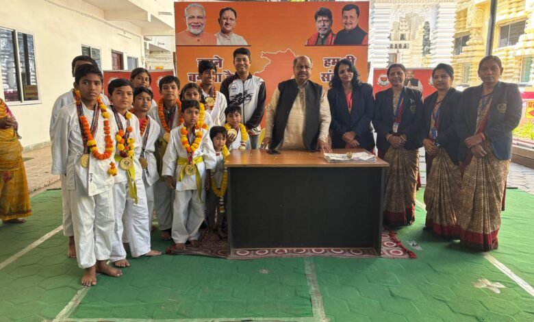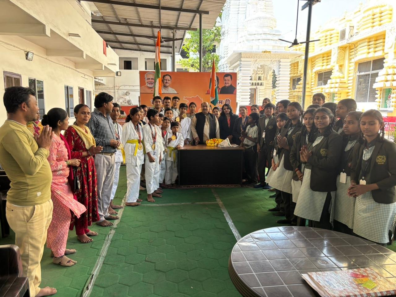 समस्त खिलाड़ियों के रायपुर वापस आने पर रायपुर उत्तर क्षेत्र के विधायक श्री पुरंदर मिश्रा जी से आशीर्वाद हेतु समस्त बच्चो जिन्होंने इंटरनेशनल कराते टूर्नामेंट में गोल्ड मेडल जीते है उन्हें विधायक जी से मुलाकात कराते हुए आशीर्वाद और सहयोग दिलाया गया ।