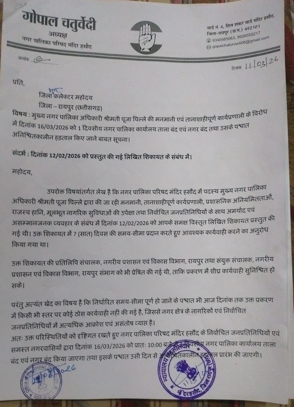 Raipur Chhattisgarh: नगर पालिका परिषद मंदिर हसौद के अध्यक्ष गोपाल चतुर्वेदी ने मुख्य नगर पालिका अधिकारी पूजा पिल्ले की कार्यप्रणाली के विरोध में 16 मार्च को नगर बंद और नगर पालिका कार्यालय में ताला बंद करने की घोषणा की है।